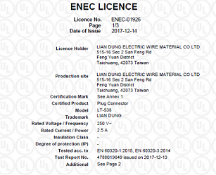 Lian Dung's LT-538 C8 connector now has ENEN Europe and UL approvals.